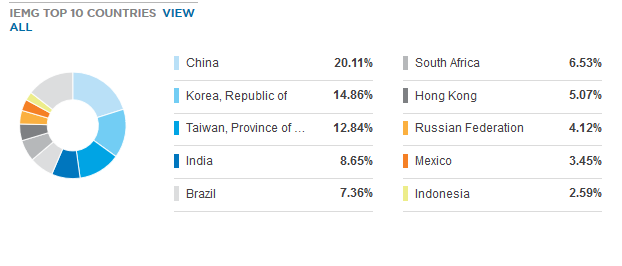 IEMGの投資先と比較すると、中国、韓国の割合が減って、代わりに台湾が増えています。